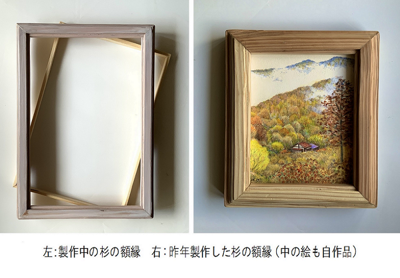 最近制作する額縁や玩具などの木工作品は、スギでつくることが多くなった。