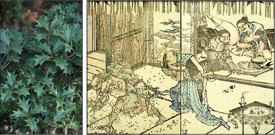 左:柊の若木の葉 右:葛飾北斎「福ハ内 鬼ハ外」絵本『北斎画譜(ほくさいがふ)上編』文政三年(1820)より